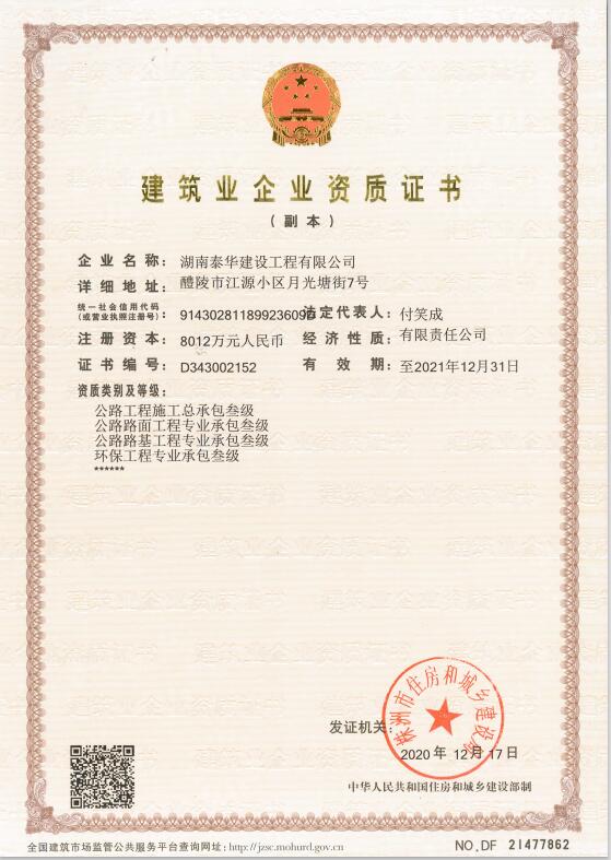湖南泰華建設工程有限公司一家房屋建筑工程施工總承包貳級,水利水電工程施工總承包貳級,市政公用工程施工總承包貳級,鋼結構工程施工專業承包二級,消防設施工程專業承包貳級,建筑裝修裝飾工程專業承包貳級;公路工程施工總承包叁級,鋼結構、體育設施、環保工程、公路路面工程、公路路基工程專業承包叁級企業?!?/div>